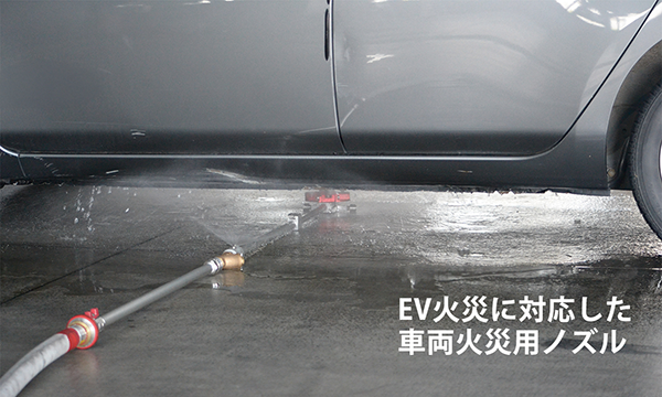 回転式の下面放水ノズルは、約2,000㎜×2,000㎜の広範囲に放水し、一般的な乗用車のLIBの大きさ