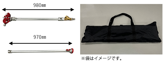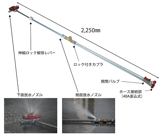 全長は2,250㎜あるため、車両から離れた位置から安全に設置ができます。また、設置後は手持ち操作が不要なため、消防隊員が安全に対応しながら再燃リスクを抑えることができます。