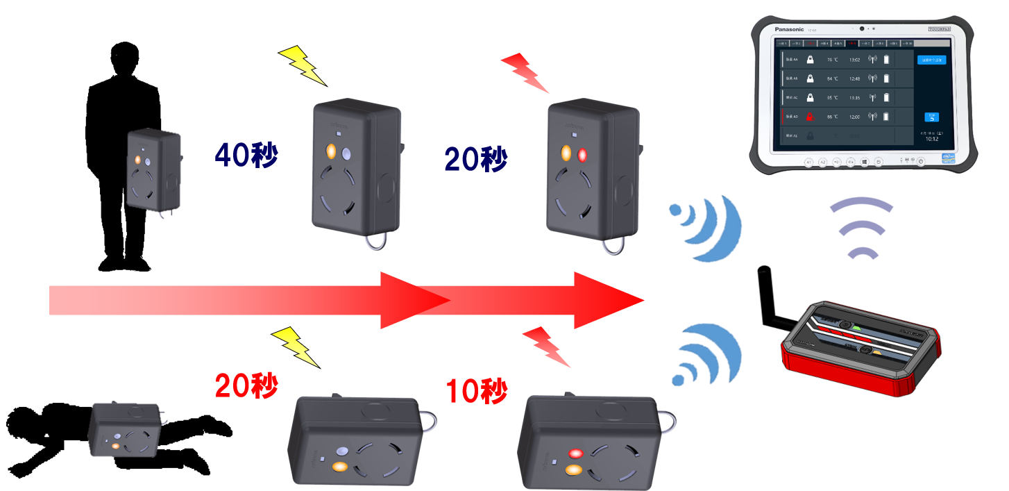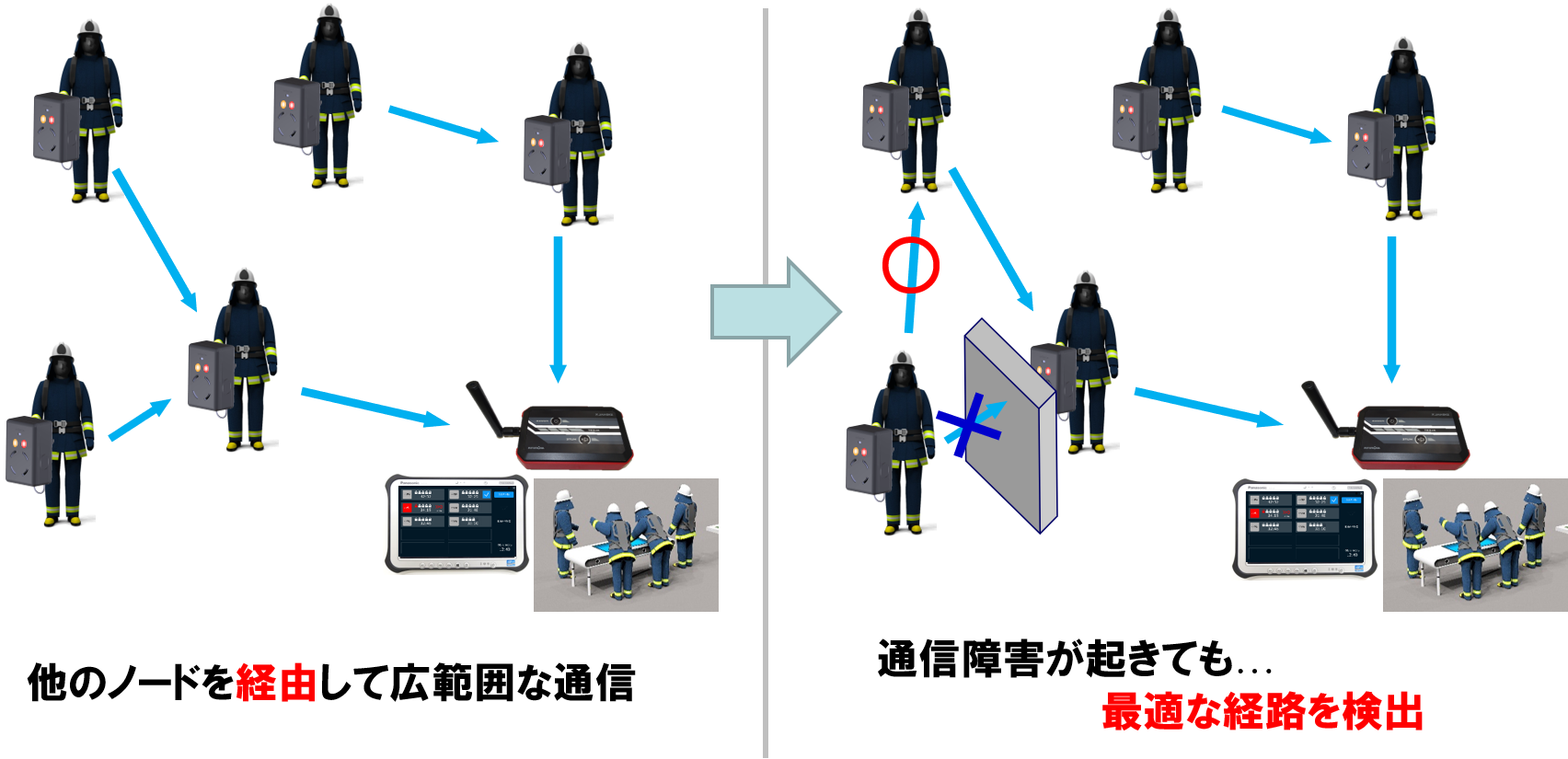 各隊員が装着するノードは中継役も果たします。通信の工夫により、隊員情報取得の確実性を高めています(特許登録)。