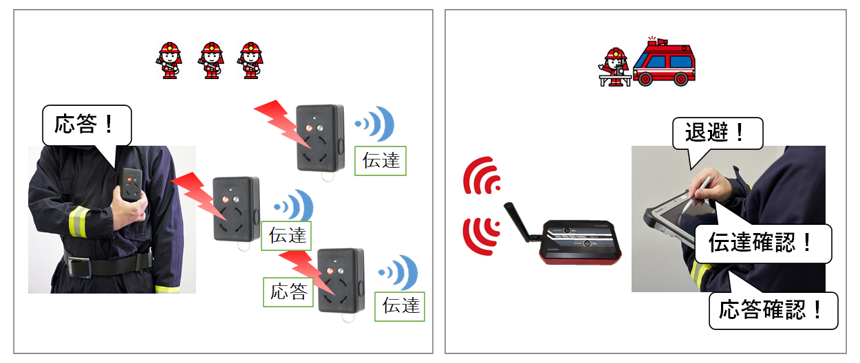 退避命令を送信した後には、ノードに命令が届いたかどうか(伝達)、および隊員の応答の有無をベースPCで確認することができ、安全管理が徹底できます。